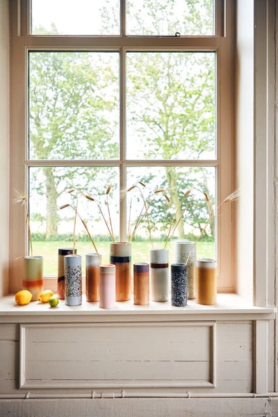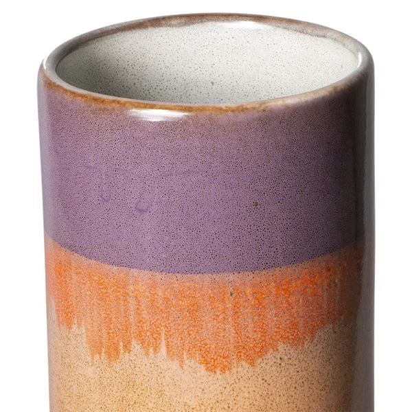 Ceramic stoneware vase from HK Livings popular 70’s range. Beautiful reactive glaze in sunset. Dimensions: 7.5x 7.5x 19cm Capacity: 1650ml. Diameter: 7.5cm Dishwasher safe.