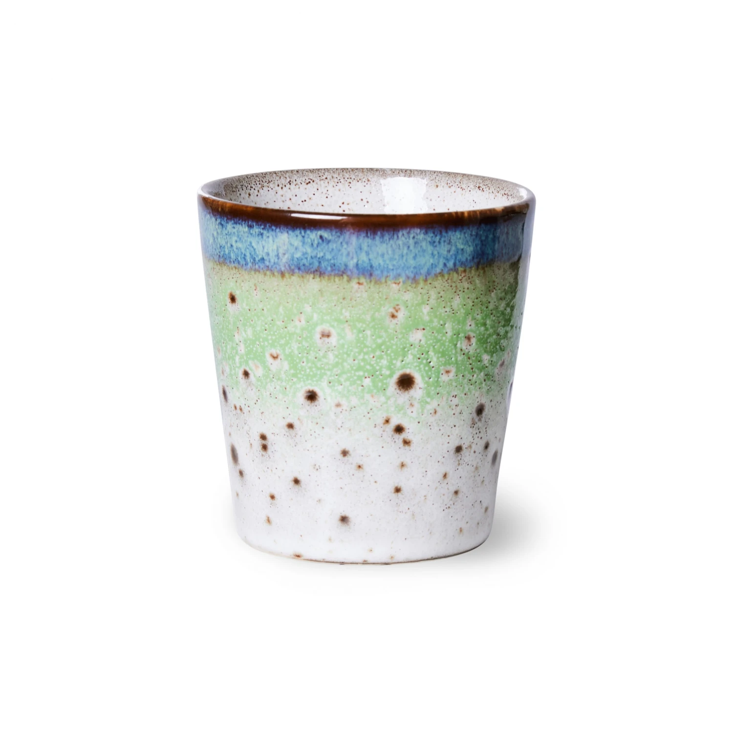 Ceramic Comet Mug from our popular 70s ceramics series features a reactive glaze design in a unique mix of whites, blues and greens with a contrasting brown rim. The glazing allows different textures and tones to show though, creating a really interesting and sophisticated effect. A unique combination that creates this beautiful Mug from the 70s inspired collection.