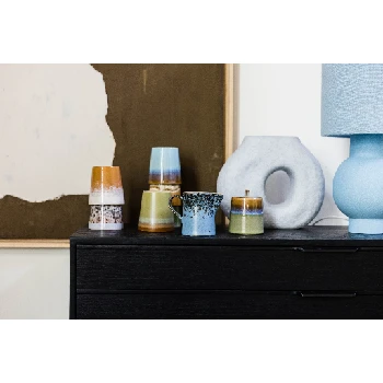 Unique form, fun hues and raw textures. A unique combination that creates this beautiful 70s inspired collection. Each Piece is hand finished with reactive glaze and therefore each piece is completely individual. Colour and design may vary due to their hand finished quality.