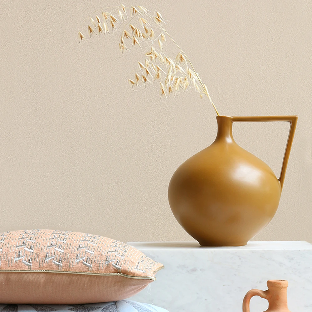 Ceramic earthenware vase with a globe profile with an amphora-like handle and a smooth, semi-gloss finish in a suggestive mustard colour. Give your table a unique finish with this elegant decorative accessory that you can complete with dried flowers or small branches and combine it with other decorative elements from the same collection.