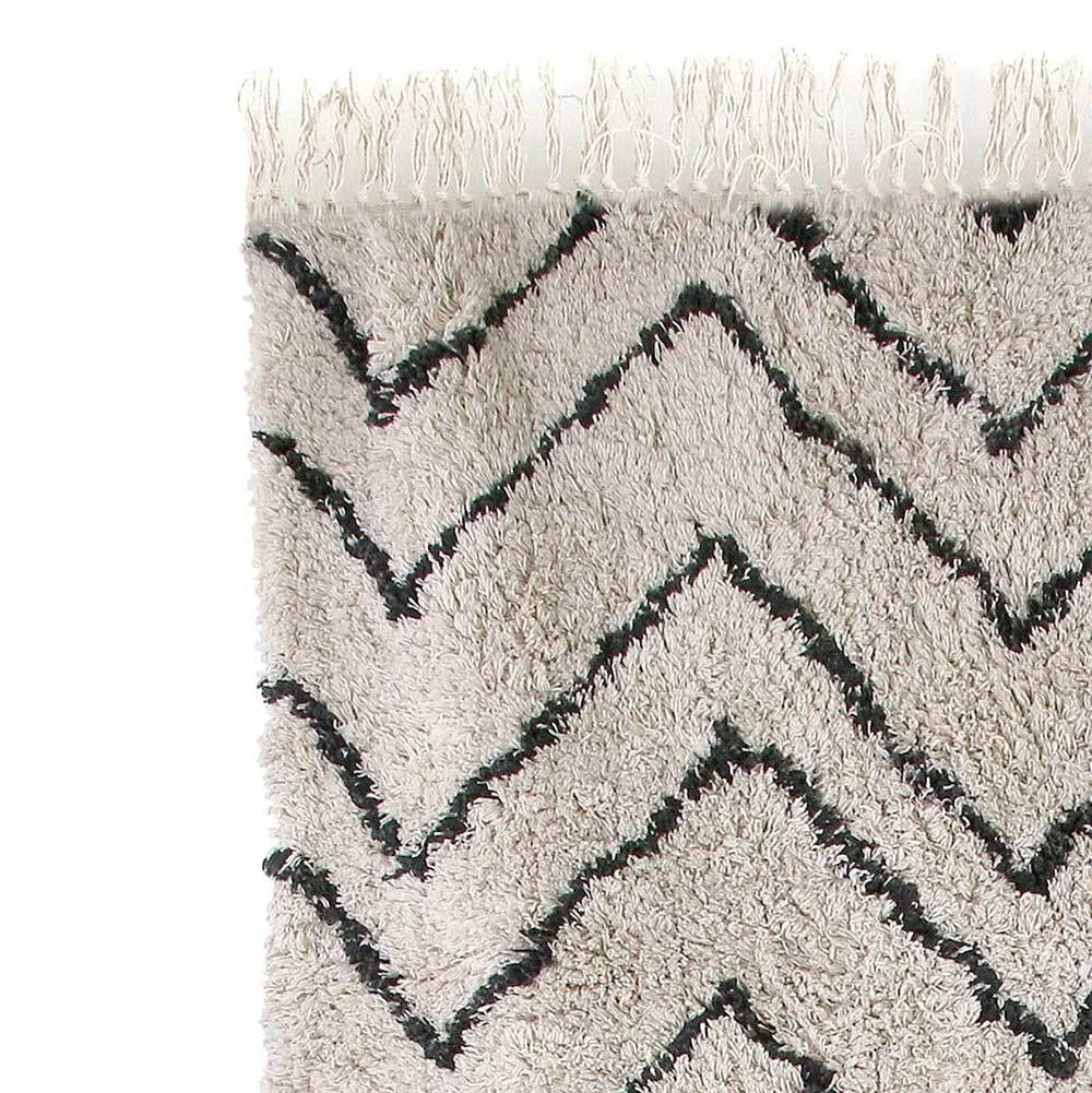 Long rectangular rug woven in cotton. Featuring a white base design with a black zigzag pattern. Its timeless and simple design makes this rug combine with all types of homes and decorations, whether in hallways, living rooms or bedrooms.