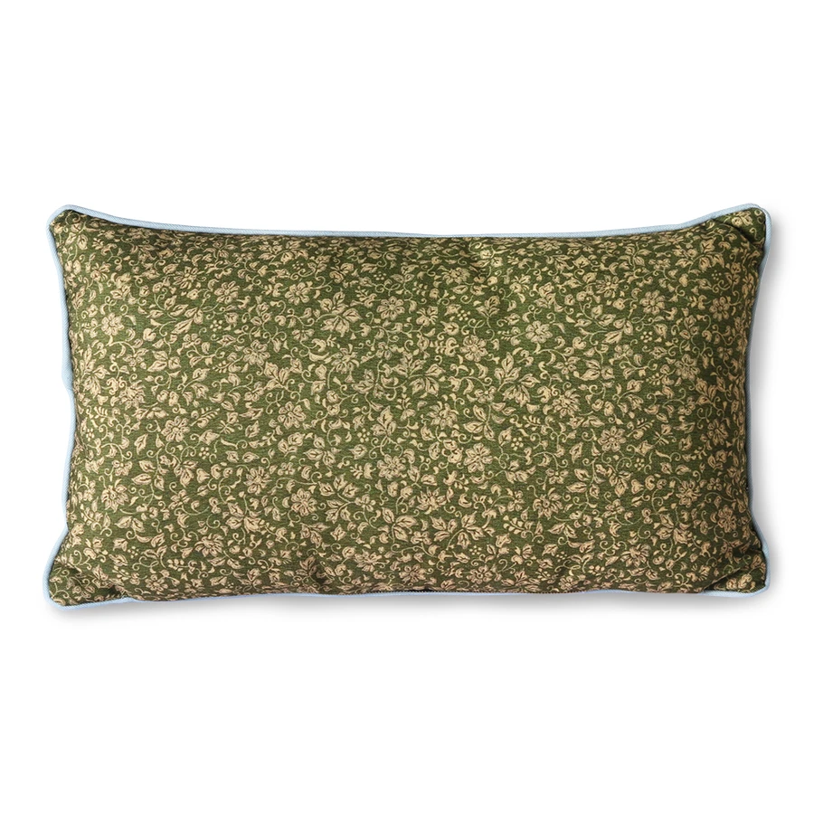 Printed cushion; night blue damast floral print on one side – moss green flower print on the other side. Ice blue piping and brass zipper closure.
