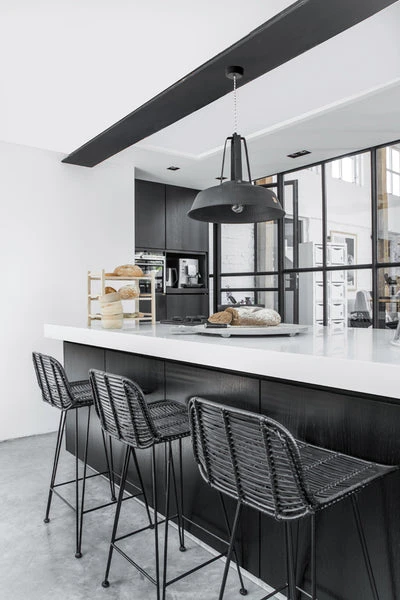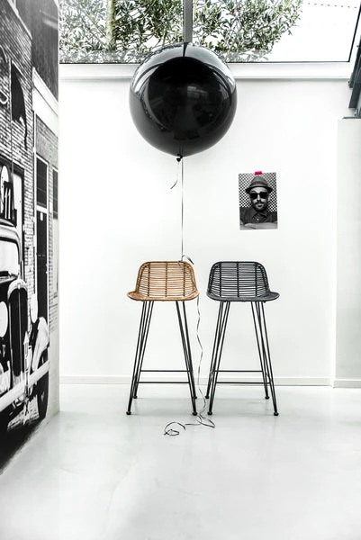 Hand braided black painted rattan barstool. Chair legs are made of black lacquered metal. Because of the natural material of the chair, it is possible that the rattan can develop small cracks. However this does not effect the product quality. Do you wish to use this chair in commercial projects? We always recommend to use this chair in combination with a seat cushion to protect your clothes. colour: Black dimensions: 42x47x89cm product length/depth (cm): 42 product width (cm): 47 product height (cm): 89 Seating height (cm): 66,5 Seating depth (cm): 40 product weight (gr): 5650 material: RATTAN/METAL/PAINT outdoor use: No Made in The Philippines.