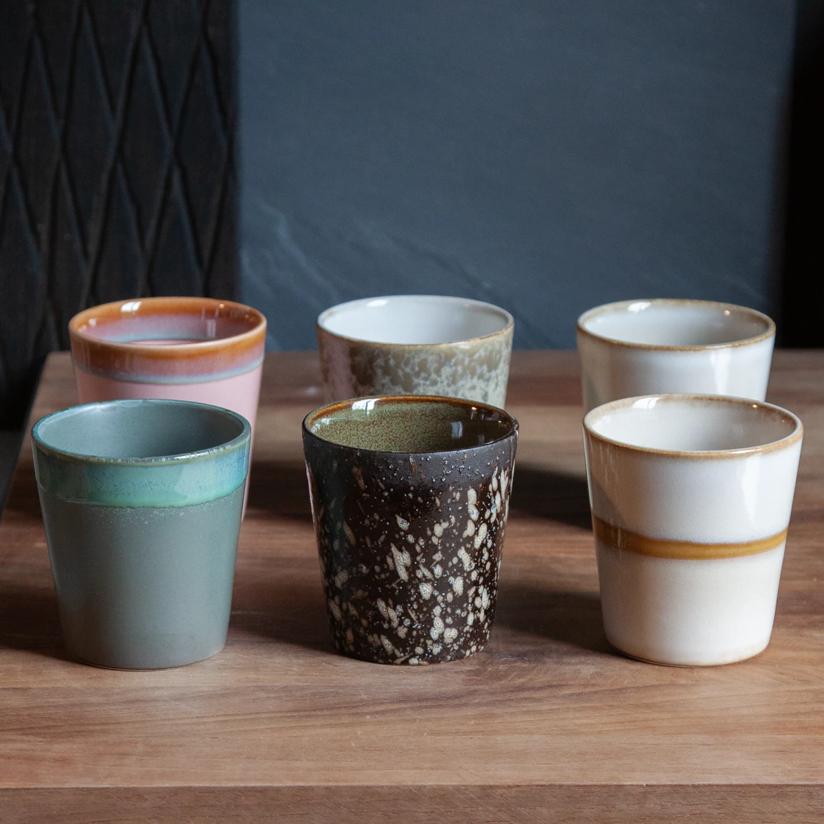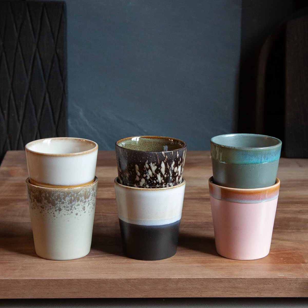 A set of 6 ceramic mugs in different colours from our popular 70’s ceramics series. The mugs are all unique due to the handmade finish. The set is packed in a black iconic 70’s ceramics gift box.