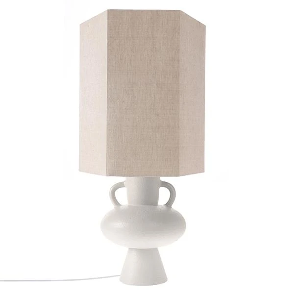 A weighty stoneware ceramic lamp base for feature atmospheric lighting. The handles are reminiscent of a heavy stoneware vessel. We recommend out semi-circle linen lampshade to fit this. ~ Size: d24 x h38cm Material: Stoneware ceramic Details: E27 bulb fitting / European plug (adaptor not included) / Max 60 Watt bulb / Wiring length (cm) 150cm / Lampshade not included